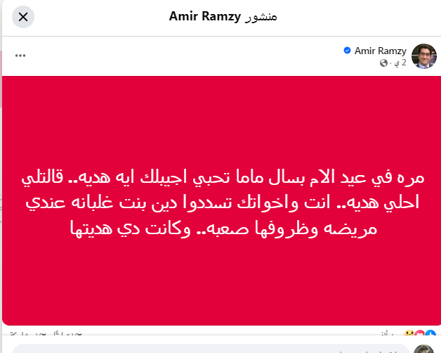 وكتب المستشار أمير رمزي في منشوره: "مرة في عيد الأم سألت ماما تحبي أجيبلك إيه هدية.. قالت لي: أحلى هدية.. أنت وأخواتك تسددوا دين بنت غلبانة عندي، مريضة وظروفها صعبة.. وكانت دي هديتها".