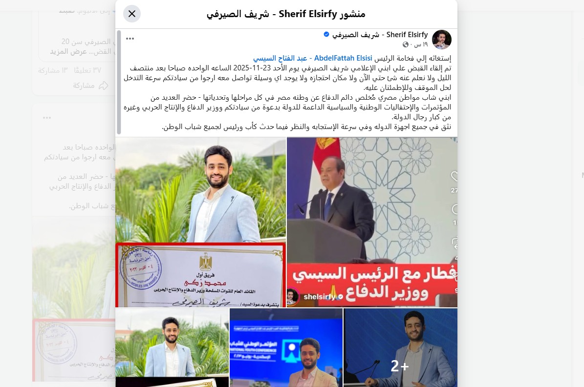 وجّه والد الإعلامي والمحلل السياسي شريف الصيرفي مناشدة إنسانية عاجلة إلى الرئيس عبد الفتاح السيسي، بعد احتجاز نجله في الساعات الأولى من صباح الأحد 23 نوفمبر 2025، مؤكدًا أن الأسرة لا تعلم حتى الآن أي تفاصيل عن مكانه أو أسباب احتجازه.
