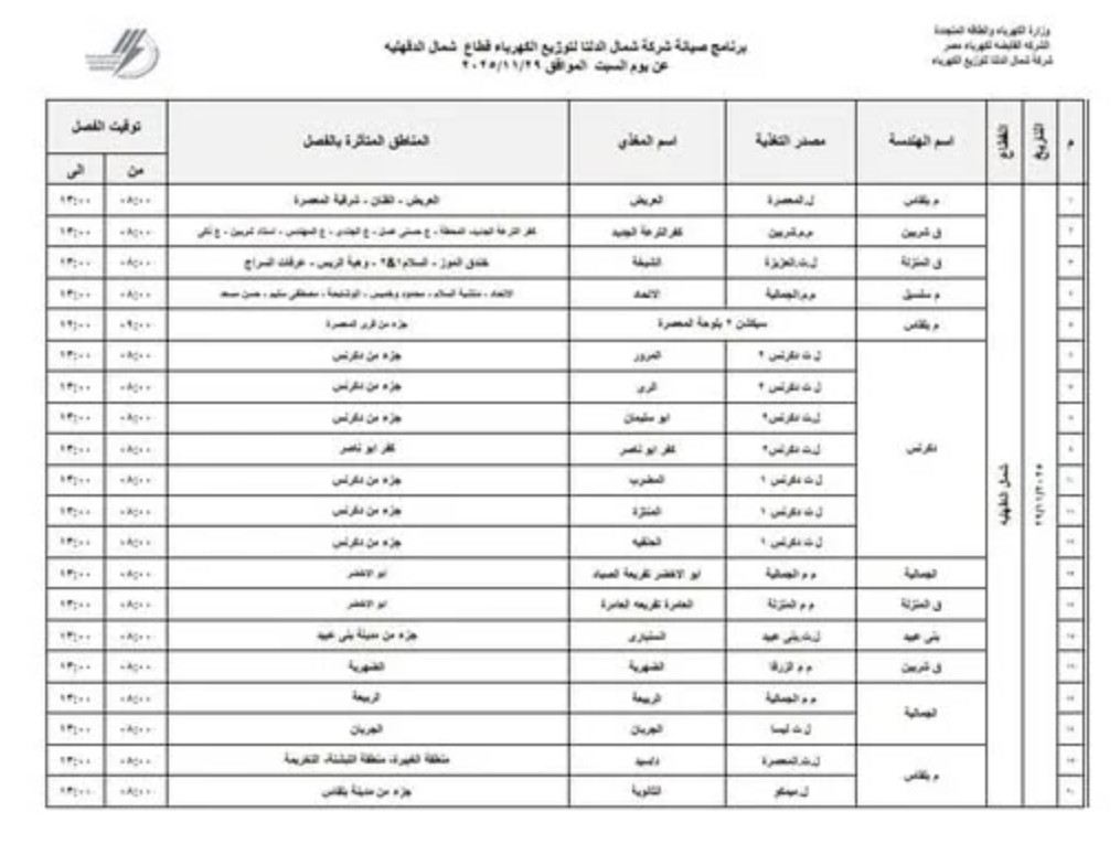شمال الدلتا تعلن فصل الكهرباء لمدة 5 ساعات غدًا السبت 29 نوفمبر 2025 بثلاث محافظات