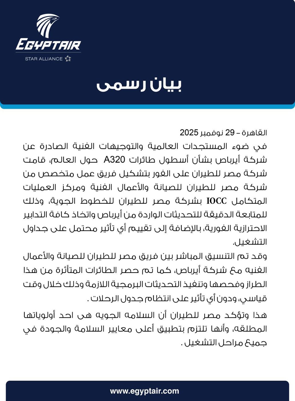 أصدرت شركة مصر للطيران، بيانا رسميا، اليوم السبت، أعلنت فيه بدء تنفيذ إجراءات فنية عاجلة عقب صدور توجيهات جديدة من شركة إيرباص تتعلق بتحديثات خاصة بطائرات A320 على مستوى العالم، وذلك في ضوء التطورات التقنية الأخيرة وتأثيرها المحتمل على أنظمة التشغيل.