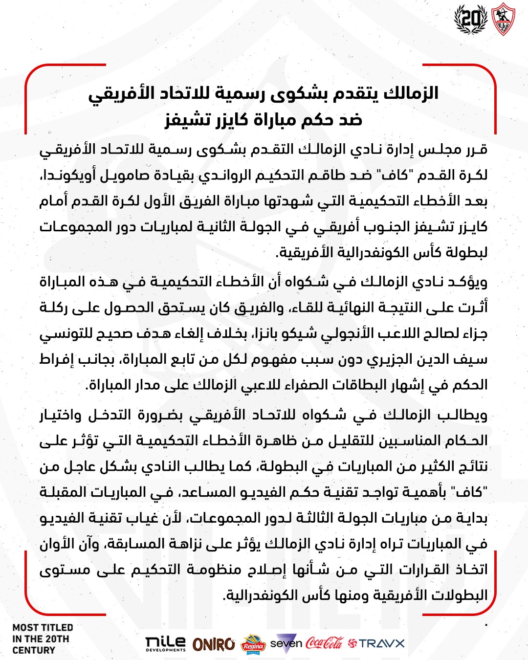 "قرر مجلس إدارة نادي الزمالك التقدم بشكوى رسمية للاتحاد الأفريقي لكرة القدم "كاف" ضد طاقم التحكيم الرواندي بقيادة صامويل أويكوندا، بعد الأخطاء التحكيمية التي شهدتها مباراة الفريق الأول لكرة القدم أمام كايزر تشيفز الجنوب أفريقي في الجولة الثانية لمباريات دور المجموعات لبطولة كأس الكونفدرالية الأفريقية.