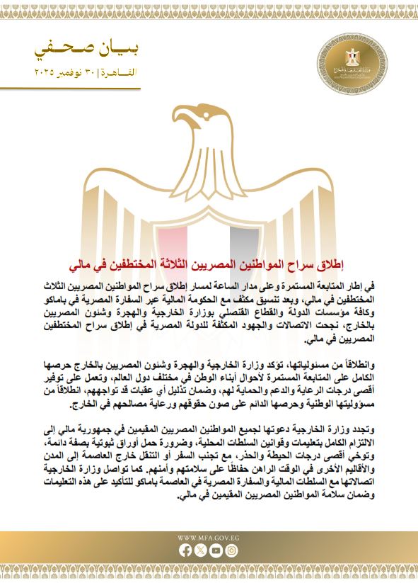 أصدرت وزارة الخارجية بيانًا رسميًا اليم الأحد، أكدت فيه نجاح جهود الدولة المصرية في إطلاق سراح المواطنين المصريين الثلاثة الذين تعرضوا للاختطاف في مالي، وذلك بعد تنسيق مستمر مع الحكومة المالية عبر السفارة المصرية في باماكو، بالإضافة إلى التعاون الكامل بين كافة مؤسسات الدولة والقطاع القنصلي بوزارة الخارجية والهجرة وشئون المصريين بالخارج.