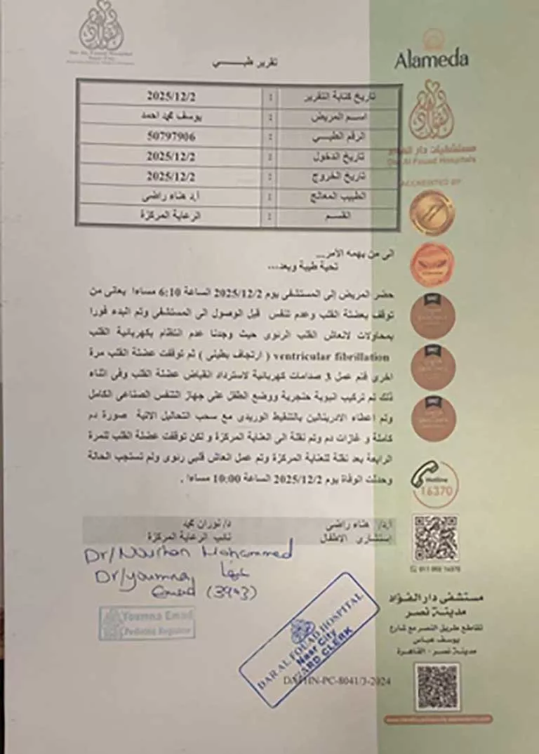 نشرت مواقع إخبارية التقرير الطبي الرسمي الذي كشف آخر تفاصيل حياة الطفل يوسف محمد، لاعب السباحة بنادي الزهور، بعد تعرضه لحالة حرجة أدت إلى توقف قلبه أربع مرات قبل وفاته مساء أمس الثلاثاء يوم 2 ديسمبر 2025.