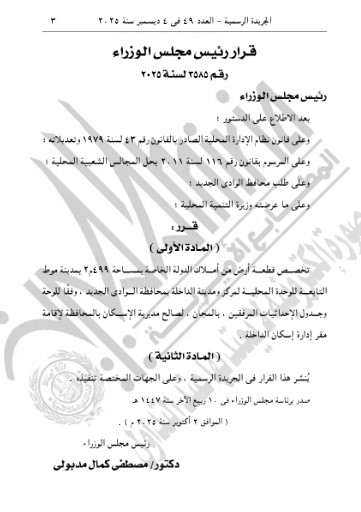 القرار رقم 3585 لسنة 2025 يقضي بتخصيص مساحة 499 مترًا مربعًا بمدينة موط بمركز الداخلة، بالمجان، لصالح مديرية الإسكان لإقامة مقر إدارة إسكان الداخلة.