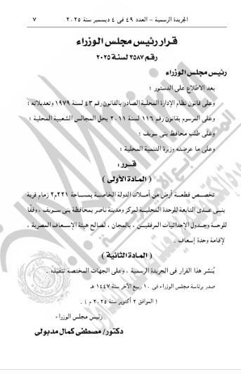 القرار رقم 3603 لسنة 2025 يتضمن تخصيص مساحة 1900 متر مربع بقرية سدس الأمراء بببا لإنشاء مدرسة تجريبية تابعة لمديرية التربية والتعليم.