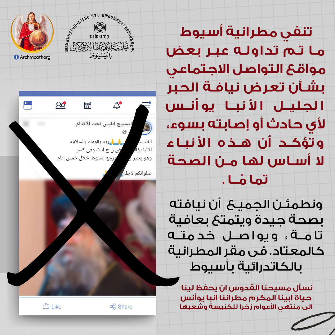 أكدت مطرانية أسيوط في بيان رسمي أن ما تم تداوله بشأن تعرض الأنبا يوأنس لأي حادث أو إصابة لا أساس له من الصحة تمامًا. وشددت المطرانية على أن هذه الأخبار عارية تمامًا عن الصحة، ولا تمت للواقع بصلة.