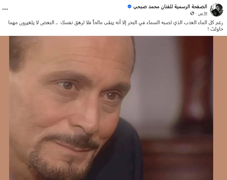 وفي أول رد له، نشر الفنان محمد صبحي عبر صفحته، مقولة قال فيها "رغم كل الماء العذب الذي تصبه السماء في البحر إلا أنه يبقى مالحاً فلا ترهق نفسك .. البعض لا يتغيرون مهما حاولت !".