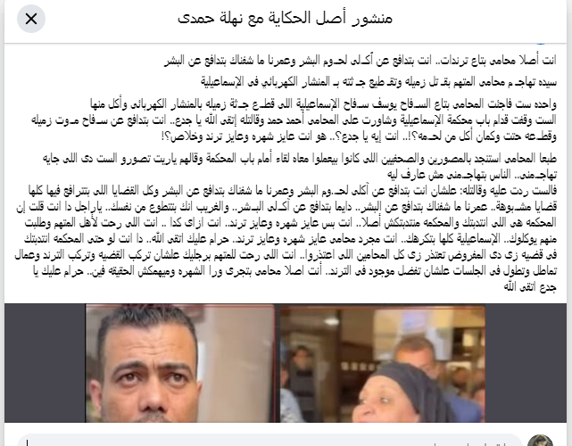 وأضافت أن المحامي – على حد قولها – لم يُعرف عنه الدفاع عن قضايا إنسانية أو مظلومين، وإنما يظهر فقط في القضايا المثيرة للجدل.