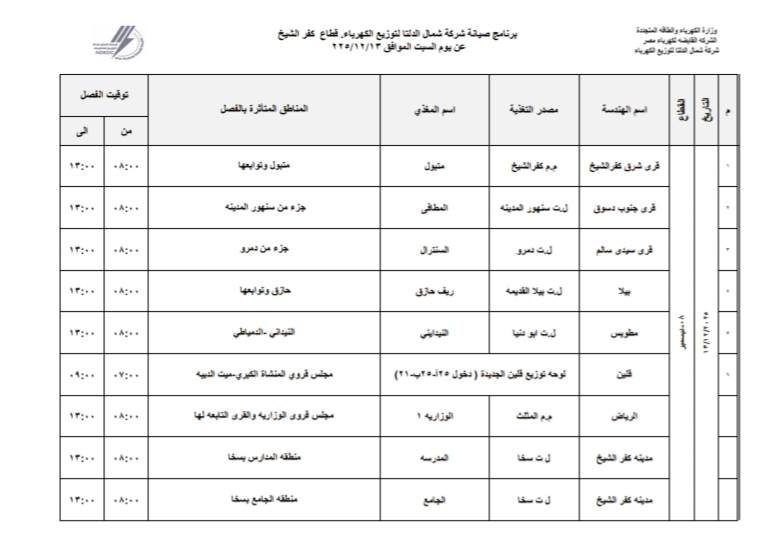 وفي محافظة كفر الشيخ، تقرر فصل الكهرباء عن مناطق تشمل: