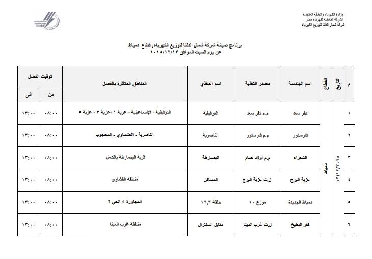 أما في محافظة دمياط، فيشمل فصل الكهرباء مناطق: