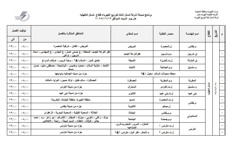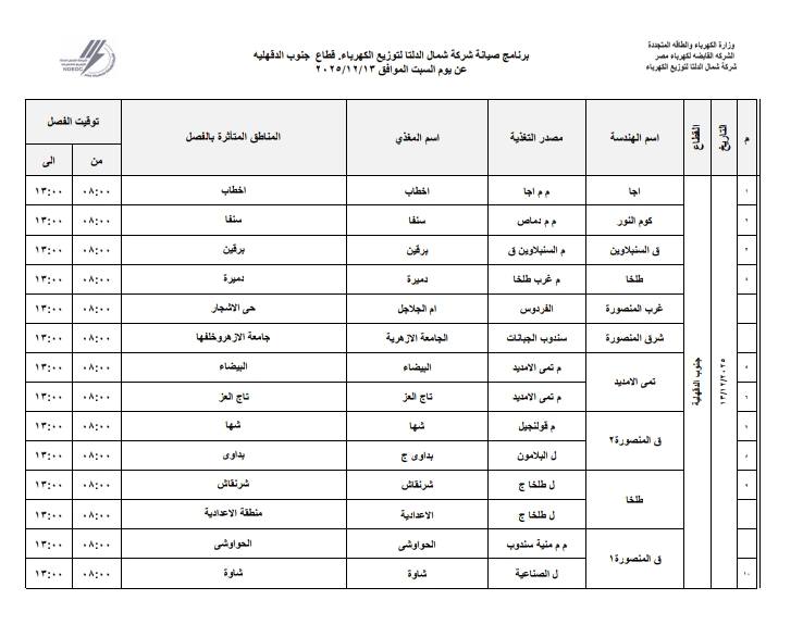 بحسب البيان الرسمي، يشمل فصل الكهرباء عددًا من المناطق والمغذيات بمحافظة الدقهلية، من بينها مناطق: