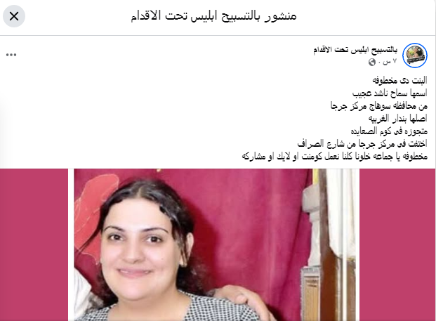 أوضحت مصادر من الاسرة ان أن قسم شرطة مركز جرجا تلقى بلاغًا رسميًا بشأن إختفاء سماح ناشد عجيب، وأنه تم تشكيل فرق بحث ميدانية بالتعاون مع الجهات الأمنية والمجتمع المدني لمتابعة أي تحركات محتملة للفتاة.