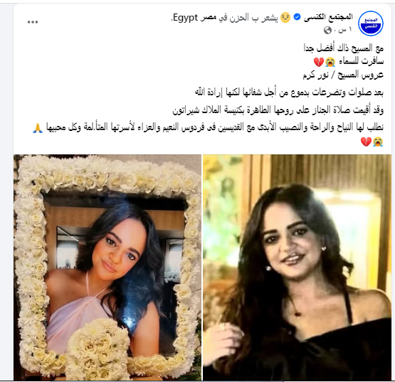 أُقيمت صلاة الجناز على روح نور كرم الطاهرة بكنيسة الملاك بشيراتون، وسط حضور كثيف من الأسرة والأصدقاء وكل من عرفوها أو تأثروا بقصتها. ساد المشهد خشوع عميق ودموع صامتة، امتزجت بتسابيح الرجاء في القيامة والحياة الأبدية، في وداع يليق بعروس للمسيح.