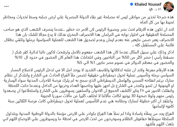 أكد خالد يوسف في منشور نشره على الفيسبوك أن انصراف هذا العدد الكبير من فئات الشعب عن التصويت لممثليهم من نواب تحت قبة البرلمان يشير بأن هناك شيئًا خاطئًا، وأن من الضروري أن يتم توجيه الاهتمام ومعرفة ما سر إهمال فئة كبيرة من الشعب للانتخابات البرلمانية التي تحدد مسار التشريعات والقوانين في البلاد.
