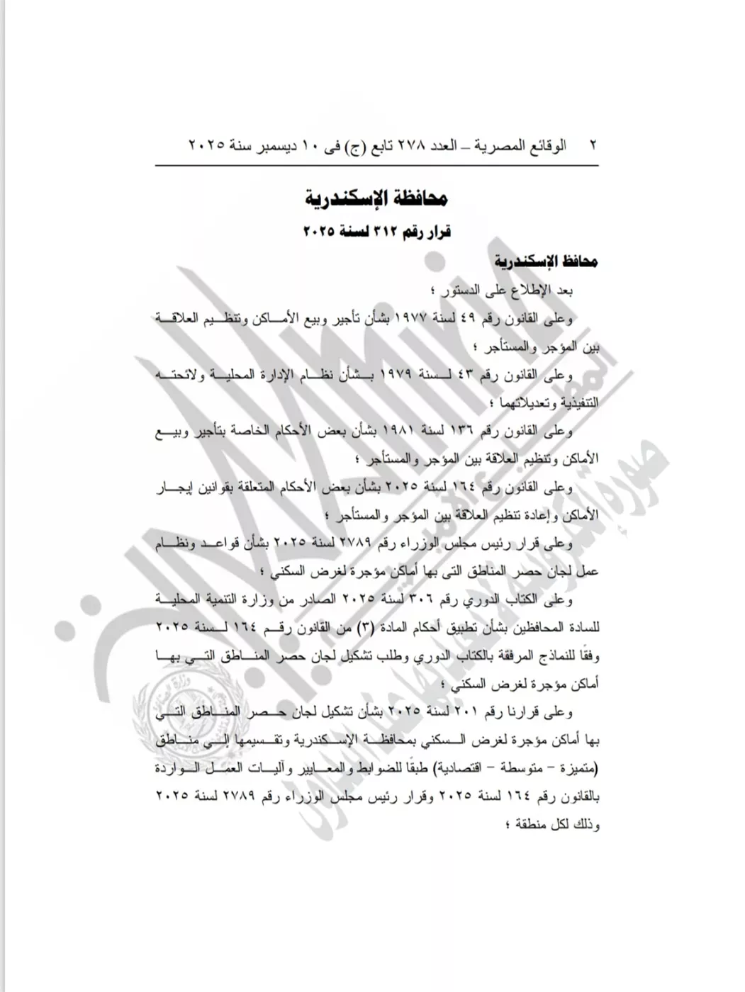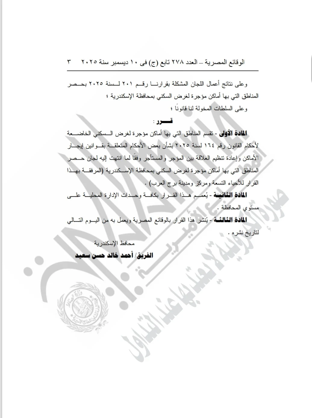 وفي الأيام الماضية، أعلنت محافظة الاسكندرية قرار انتهاء حصر المناطق، حيث أصدر الفريق أحمد خالد، محافظ الإسكندرية، القرار رقم 312 لسنة 2025، بشأن تقسيم المناطق السكنية المؤجرة وفق القانون الجديد، وقد تم فرز المناطق إلى ثلاث فئات رئيسية لضمان تفعيل القيمة الإيجارية الجديدة بشكل يتناسب مع طبيعة كل منطقة ومستوى الخدمات المتوفرة فيها، مع وضع نسب زيادة سنوية موحدة تصل إلى خمسة عشر بالمئة لتعكس التطورات الاقتصادية وتكاليف الصيانة والخدمات.