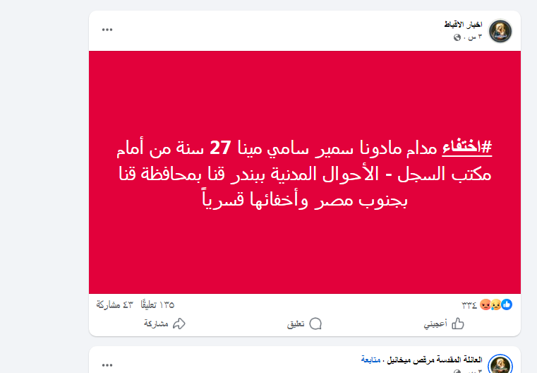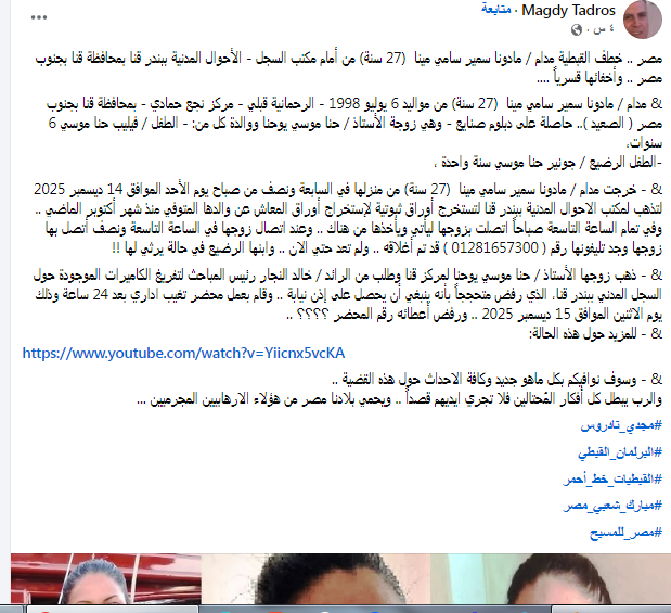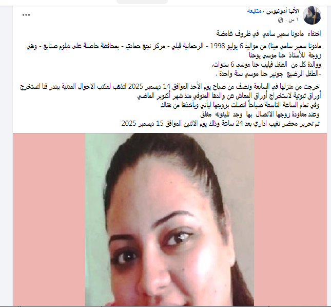 تعيش محافظة قنا حالة من الحزن والقلق بعد اختفاء الشابة مادونا سمير سامي مينا (27 سنة) من أمام مكتب السجل المدني ببندر قنا صباح يوم الأحد 14 ديسمبر 2025، في واقعة أثارت الرأي العام المحلي، خصوصًا أن الشابة أم لطفلين أحدهما رضيع.