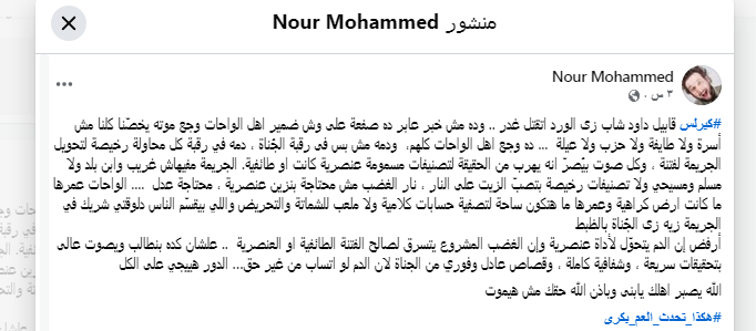 أثارت واقعة مصرع كيرلس قابيل داود موجة غضب واسعة بين أهالي الوادي الجديد، الذين طالبوا بتوقيع أقصى العقوبات على الجناة، مؤكدين أن الجريمة لا يمكن وصفها بمشاجرة، بل هي قتل متعمد لشاب كان يسعى لكسب رزقه بالحلال.