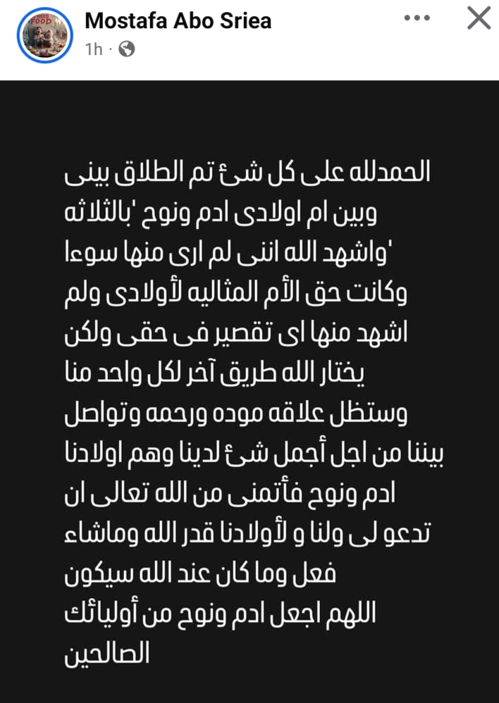 كتب مصطفى أبو سريع على حسابه الشخصي على فيسبوك: "الحمد لله على كل حال. تم الطلاق بيني وبين أم أولادى آدم ونوح "بالثلاثة".