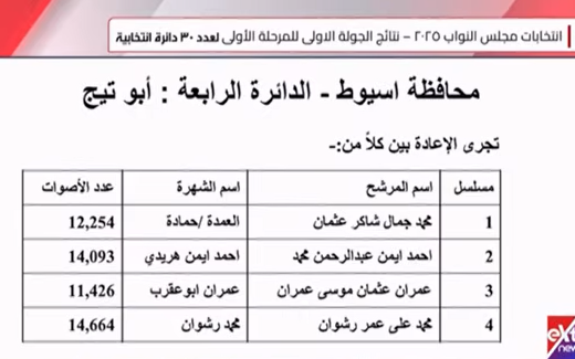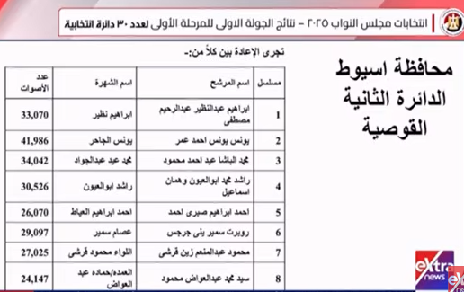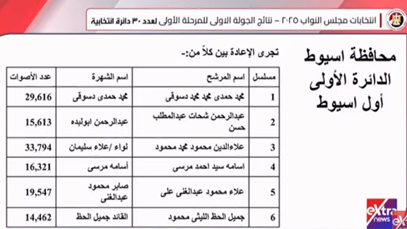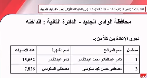 وفي المقابل، تقرر إجراء جولة إعادة في عدد من الدوائر، حيث تشهد دائرة القرنة بالأقصر منافسة جديدة بين المرشحين علاء الغزالي وعبد الستار محمد رضا، بعد عدم حسم النتيجة من الجولة الأولى.
