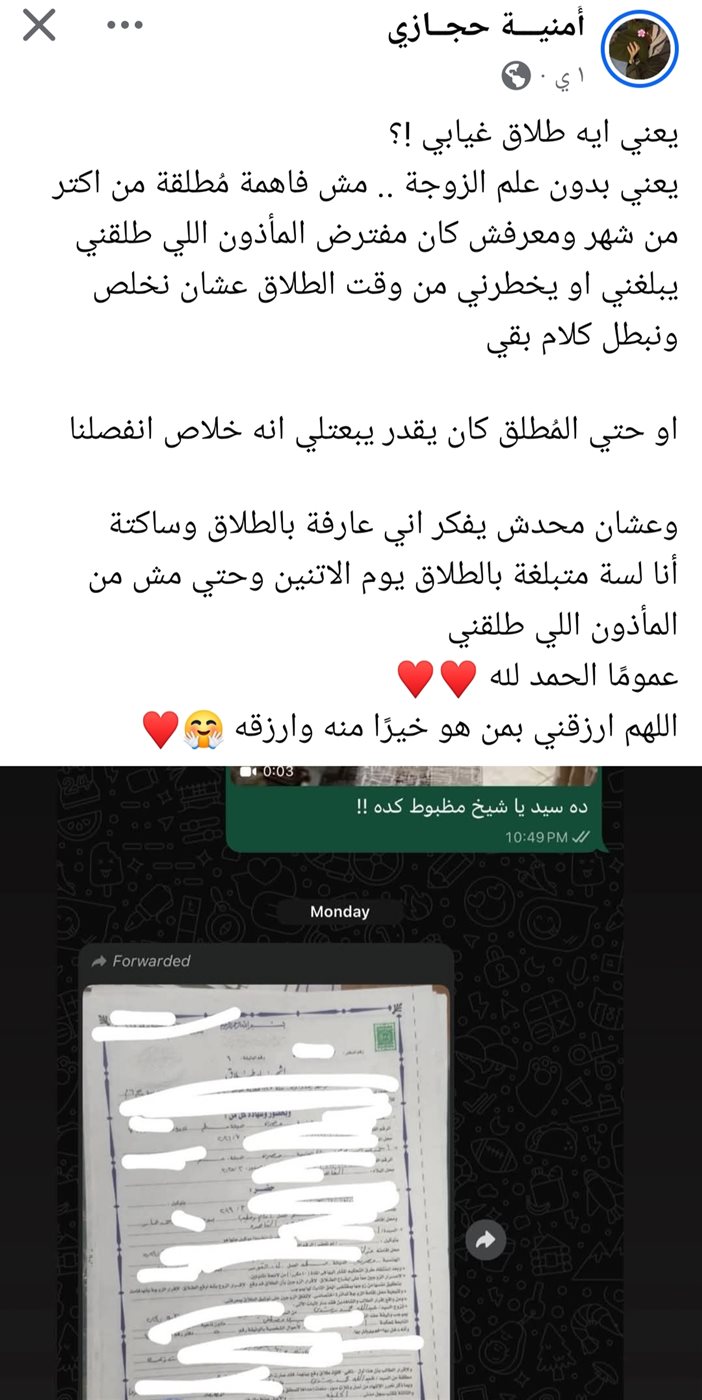 أمنية حجازي أوضحت، عبر منشور مطول على حسابها الشخصي، أن الطلاق تم غيابيًا منذ أكثر من شهر دون علمها، مشيرة إلى أنها لم تُخطر بالانفصال إلا مؤخرًا، ما فتح باب التساؤلات حول الإجراءات المتبعة في واقعة طلاق زوجة عبدالله رشدي دون إخطارها الرسمي في حينه.