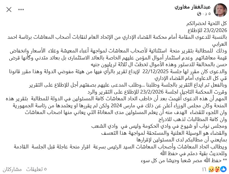 كشف المحامي عبد الغفار مغاوري عبر صفحته الشخصية على منصة فيسبوك، تفاصيل ما حدث في الدعوى المقامة للمطالبة بصرف المنحة الاستثنائية لأصحاب المعاشات أمام محكمة القضاء الإداري، حيث عقدت المحكمة جلسة نظر أمس الاثنين للنظر في الدعوى.