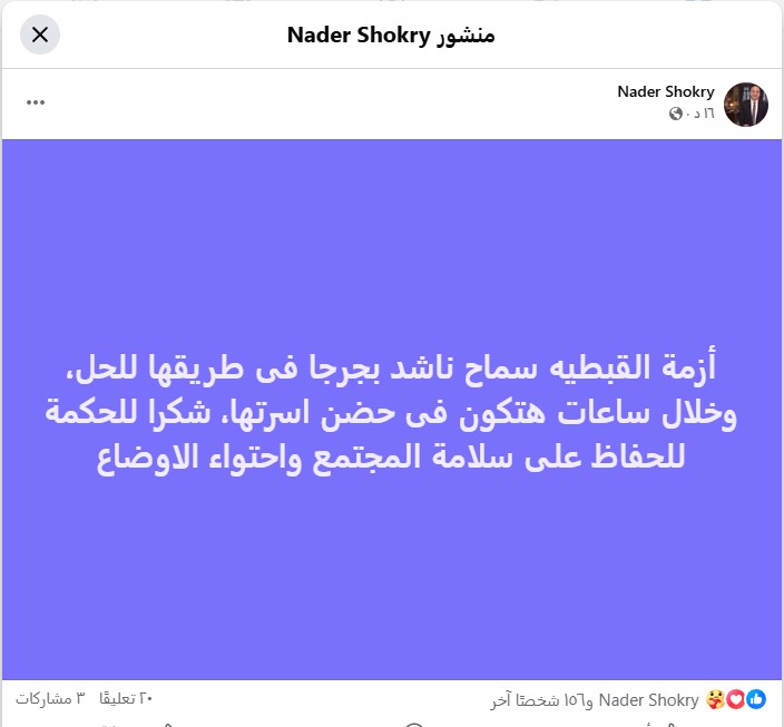 ويأتي إعلان نادر شكري ليعزز هذه الرواية، خصوصًا بعد تأكيده أن الأزمة انتهت «بالحكمة» وأن الجهات المعنية كانت حريصة على احتواء الموقف ومنع أي احتقان داخل المجتمع.