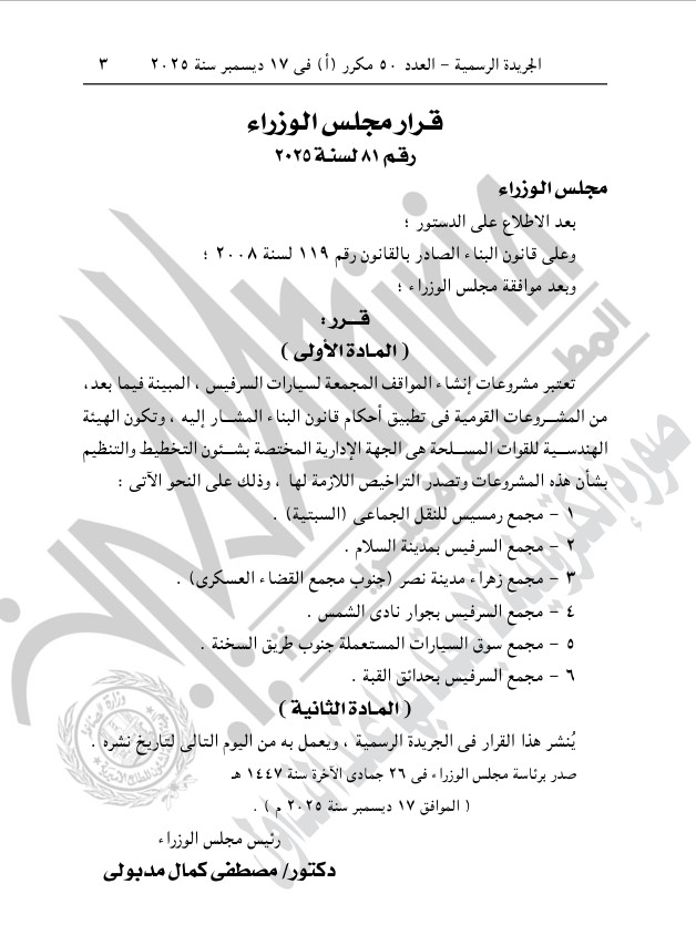قامت الجريدة الرسمية، في عددها بتاريخ 17 ديسمبر 2025، بنشر ثلاثة قرارات جديدة اصدرها مجلس الوزراء ورئيس مجلس الوزراء الدكتور مصطفى مدبولي، تضمنت اعتبار عدد من مشروعات النقل الجماعي مشروعات قومية، والموافقة على إنشاء فروع لجامعتي القاهرة والإسكندرية خارج البلاد، إلى جانب إلغاء تخصيص قطعة أرض من أملاك الدولة كانت مخصصة لوزارة الداخلية.