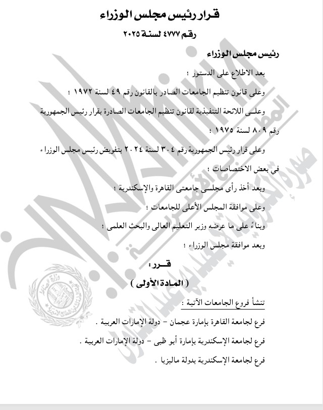 وفي السياق ذاته، نص قرار رئيس مجلس الوزراء رقم 4777 لسنة 2025 على الموافقة على إنشاء فروع جديدة لجامعات مصرية خارج مصر، شملت إنشاء فرع لجامعة القاهرة بإمارة عجمان في دولة الإمارات العربية المتحدة، وفرع لجامعة الإسكندرية بإمارة أبو ظبي، إلى جانب فرع آخر لجامعة الإسكندرية بدولة ماليزيا.