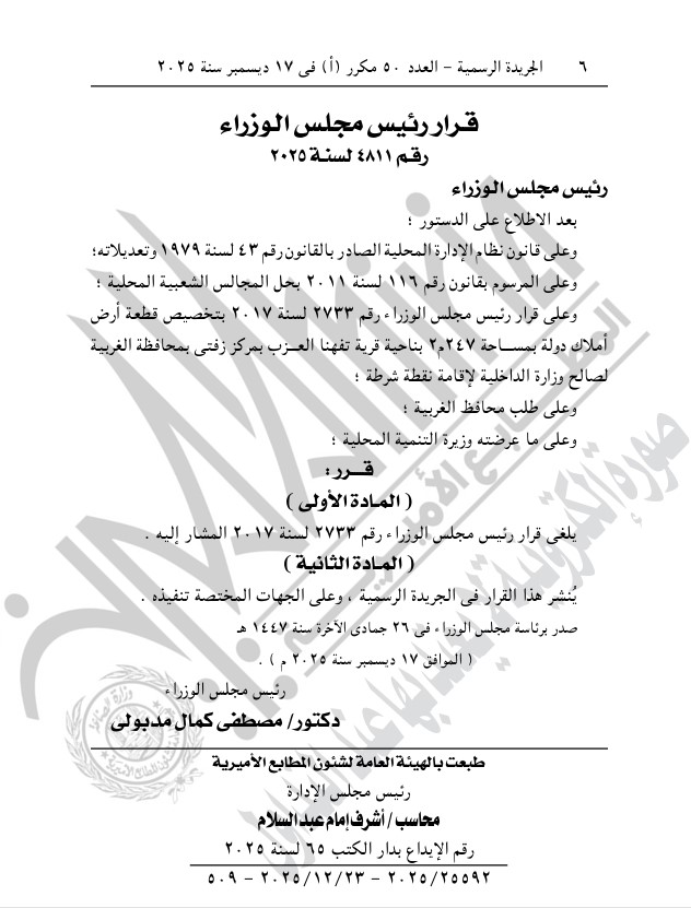 كما تضمن العدد ذاته صدور قرار رئيس الوزراء رقم 4811 لسنة 2025، والذي يقضي بإلغاء قرار سابق صدر عام 2017، كان ينص على تخصيص قطعة أرض من أملاك الدولة الخاصة بمساحة 247 مترًا مربعًا بقرية تفهنا العزب التابعة لمركز زفتى بمحافظة الغربية، لصالح وزارة الداخلية لإقامة نقطة شرطة، دون أن يوضح القرار أسباب الإلغاء.