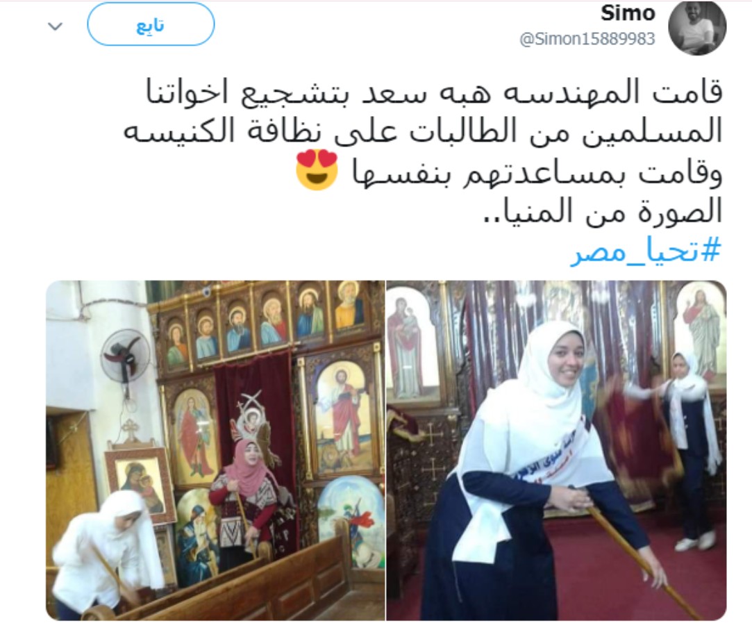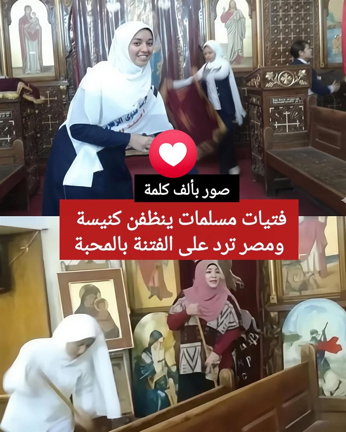 الصور المتداولة عبر منصات التواصل الاجتماعي، خاصة موقع «تويتر»، أظهرت فتيات مسلمات وهن يقمن بتنظيف أرضيات ومقاعد ونوافذ إحدى الكنائس بمحافظة المنيا، في مشهد لاقى إشادة واسعة من المتابعين، الذين اعتبروه رسالة عملية تعكس روح الوحدة الوطنية.