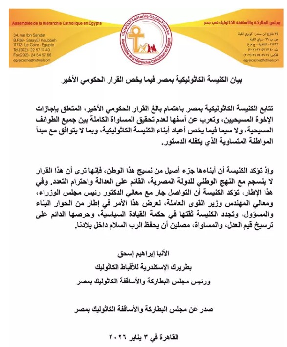أصدرت الكنيسة الكاثوليكية في مصر، بيانا رسميا، وأعلنت عن متابعتها للقرار الحكومي الأخير المتعلق بتنظيم إجازات الإخوة المسيحيين، معربة عن أسفها لعدم تحقيق المساواة الكاملة بين الطوائف المسيحية، وبخاصة فيما يتعلق بأعياد أبناء الكنيسة الكاثوليكية، وهو ما اعتبرته لا يتوافق مع مبدأ المواطنة المتساوية الذي نص عليه الدستور.