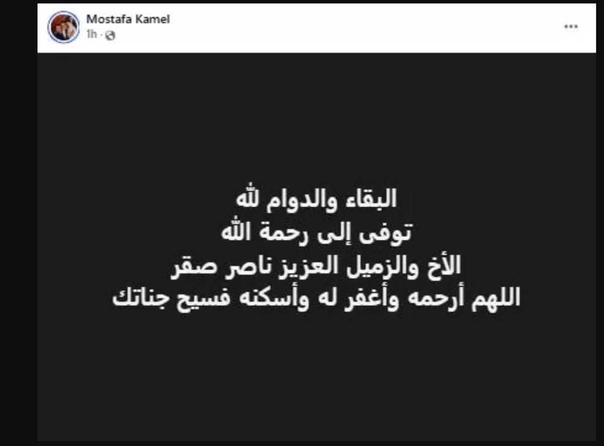نعى الفنان مصطفى كامل، نقيب المهن الموسيقية، المطرب الشعبي ناصر صقر بكلمات مؤثرة عبر صفحته الرسمية على موقع فيسبوك، حيث كتب:
