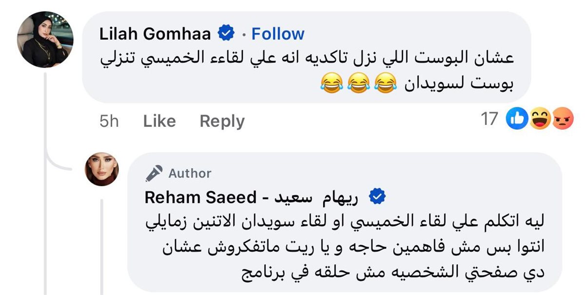 ومع تصاعد الانتقادات، ردت ريهام سعيد على تعليق إحدى المتابعات بصفحتها الشخصية، وقالت: ""ليه أتكلم على لقاء الخميسي أو لقاء سويدان؟ الاثنين زمايلي".