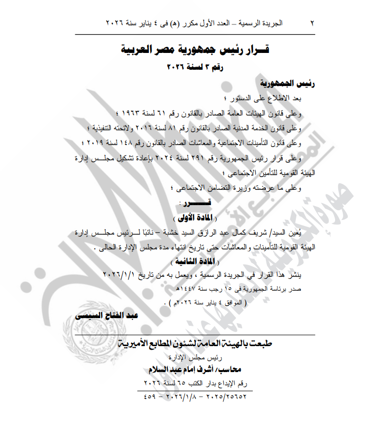 نص القرار الجمهوري على أن يعمل به اعتبارًا من الأول من يناير 2026، في إطار تنظيم الهيكل الإداري للهيئة القومية للتأمينات والمعاشات، بما يضمن استمرار الأداء المؤسسي وتسيير الأعمال خلال الفترة المتبقية من عمر المجلس الحالي.