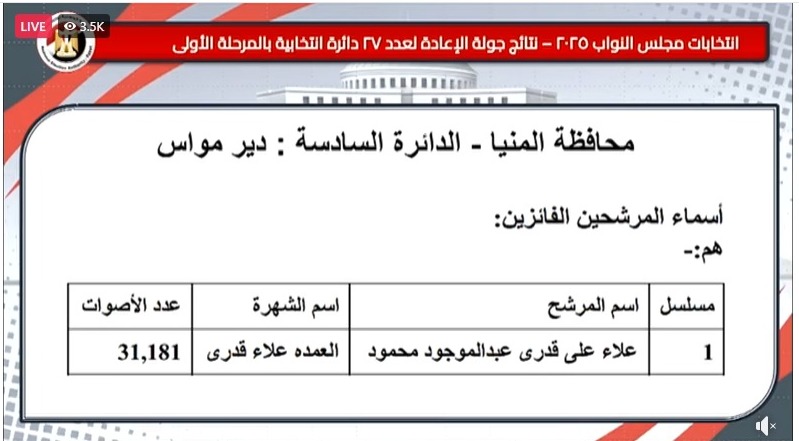 أسماء الفائزين بجولة إعادة انتخابات مجلس النواب بـ27 دائرة ملغاة وإعلان اكتمال تشكيل البرلمان الجديد