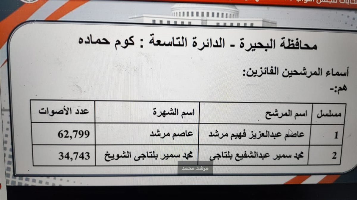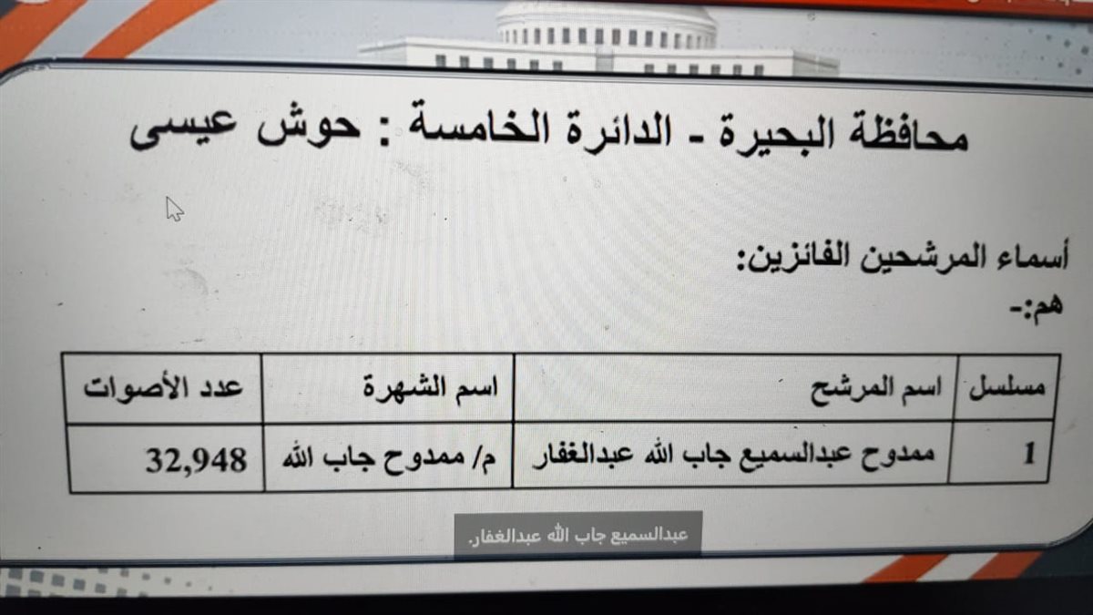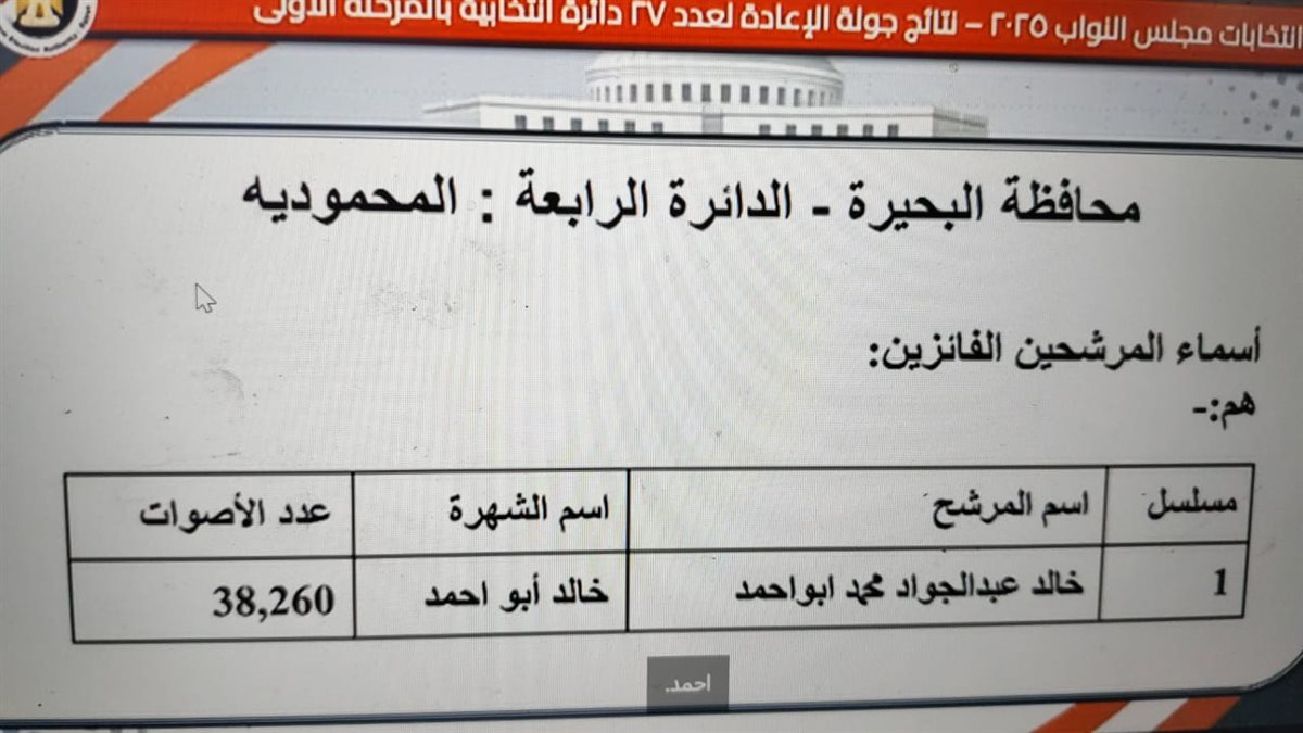 وفي محافظة البحيرة، أظهرت النتائج فوز خالد أبو أحمد عن الدائرة الرابعة بالمحمودية، فيما حصل المهندس ممدوح جاب الله على مقعد الدائرة الخامسة بحوش عيسى.