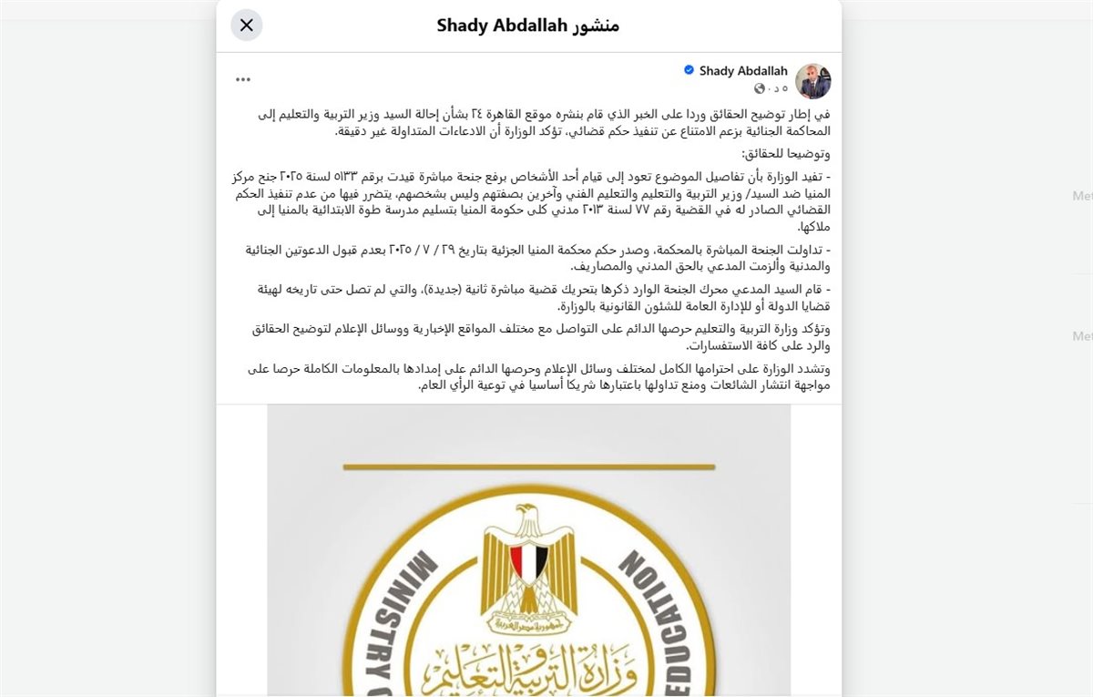 إعادة نشر أخبار غير مكتملة أو غير دقيقة حول محاكمة وزير التربية والتعليم تعكس خطورة الاعتماد على مصادر غير موثوقة، خاصة في القضايا القانونية، وتبرز أهمية البيانات الرسمية في توضيح السياق القانوني الكامل بعيدًا عن الاجتزاء أو التأويل.