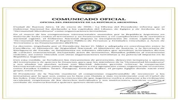 دائماً ما تكون الأرجنتين ملفتة للأنظار للجماعات المحظورة، حيث إن تنظيم داعش كان قد بدأ ينشر عملاء استخباراته فيها، وحالياً هناك تواجد لـ الإخوان في البلاد، وبناءً عليه قررت الحكومة ملاحقة كل من ينتمي لتلك الجماعة.