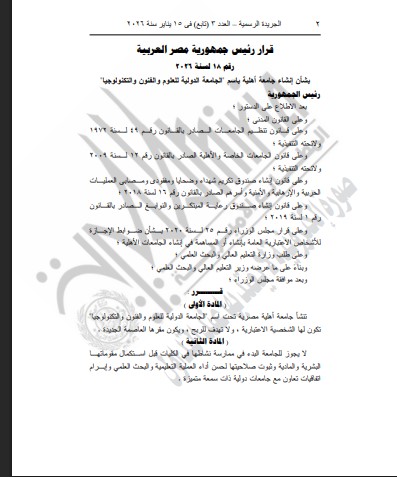 وبموجب القرار، سيتم إنشاء الجامعة ككيان تعليمي مصري يتمتع بالشخصية الاعتبارية المستقلة، على أن تعمل وفق نظام الجامعات الأهلية غير الهادفة للربح، ويكون مقرها الرئيسي في العاصمة الإدارية الجديدة، بما يدعم خطط الدولة لتطوير البنية التعليمية وربطها بالمجتمعات العمرانية الحديثة.