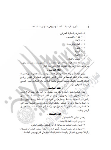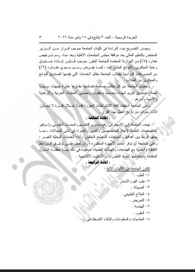 وأكد القرار الجمهوري أن الجامعة لن يسمح لها ببدء الدراسة أو ممارسة النشاط الأكاديمي داخل كلياتها إلا بعد استيفاء جميع المتطلبات اللازمة، سواء من حيث الكوادر البشرية المؤهلة أو الإمكانات المادية، مع ضرورة التأكد من جاهزيتها الكاملة لتقديم تعليم وبحث علمي على مستوى متميز، إلى جانب إبرام اتفاقيات تعاون مع جامعات دولية ذات مكانة أكاديمية مرموقة.