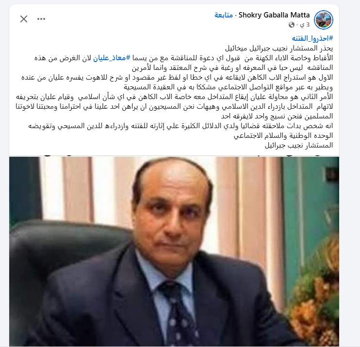 المستشار نجيب جبرائيل أطلق تحذيرًا واضحًا موجّهًا إلى الأقباط، وخاصة الآباء الكهنة، دعا خلاله إلى عدم الاستجابة لأي دعوات منسوبة إلى معاذ عليان لإجراء مناقشات أو حوارات دينية، مؤكدًا أن هذه الدعوات – بحسب ما ورد في بيانه – لا تهدف إلى المعرفة أو الفهم المتبادل، وإنما قد تقود إلى إثارة فتنة طائفية تهدد السلم المجتمعي.