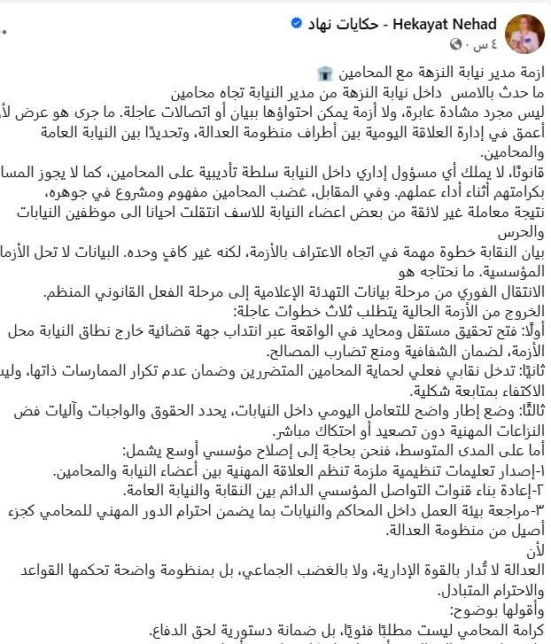 واقترحت أبو القمصان ثلاث خطوات عاجلة للخروج من الأزمة، أولًا، ضرورة فتح تحقيق مستقل ومحايد من جهة قضائية خارج نطاق النيابة المعنية، لضمان الشفافية ومنع أي تضارب في المصالح. ثانيًا، تفعيل الدور النقابي بشكل فعلي لحماية المحامين المتضررين وضمان عدم تكرار أي ممارسات مشابهة، بدل الاكتفاء بالمتابعة الشكلية. وأخيرًا، ضرورة وضع إطار واضح للتعامل اليومي داخل النيابات يحدد الحقوق والواجبات وآليات فض النزاعات المهنية، بما يحمي الجميع من الاحتكاك المباشر أو التصعيد.