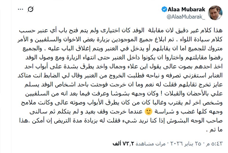 وتابع علاء مبارك أنه فور خروجه فوجئ بأحد أعضاء الوفد يستقبله بالأحضان والقبلات، وتبين لاحقًا أنه ينتمي للتيار السلفي، بينما ظل شخص آخر، بدا عليه الغضب، واقفًا على مسافة دون أن يتحدث.