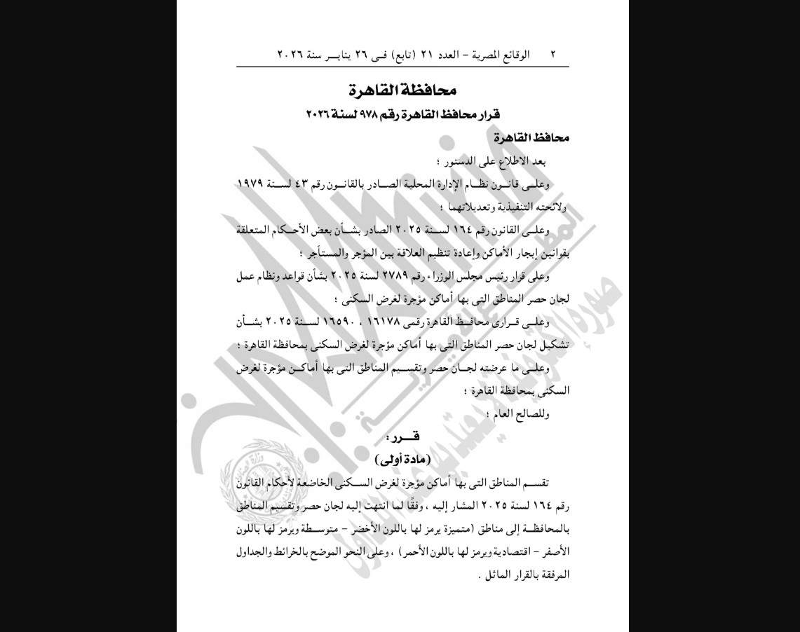 وجاء القرار بعد الاطلاع على الدستور، وقانون الإدارة المحلية رقم 43 لسنة 1979، والقانون رقم 164 لسنة 2025 الخاص بتنظيم بعض الأحكام المتعلقة بالعلاقة بين المؤجر والمستأجر.