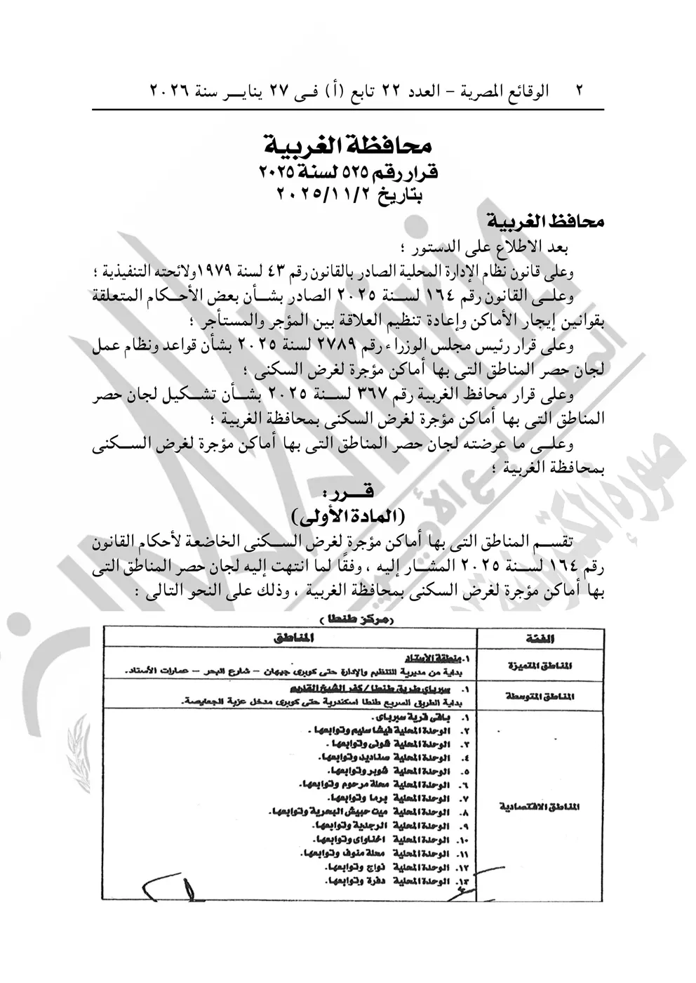 وفي سياق متصل، نشرت الجريدة الرسمية في عددها الصادر اليوم الثلاثاء قرار محافظة الغربية رقم 525 لسنة 2025، شأن تقسيم المناطق التي تضم أماكن مؤجرة لغرض السكنى والخاضعة لأحكام القانون الجديد ، وننشر لكم تفاصيل القرار في الجريدة الرسمية بالمستندات المرفقة اسفل