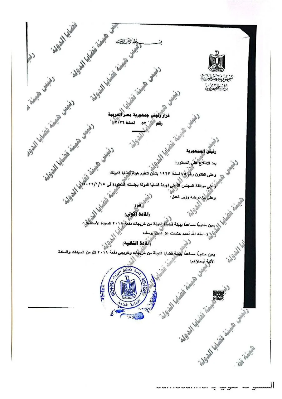 ويأتي هذا التعيين ضمن حركة دورية تهدف إلى ضخ دماء جديدة في الهيئة، بما يسهم في رفع كفاءة الأداء القانوني، ودعم دور هيئة قضايا الدولة في الدفاع عن حقوق الدولة وصون المال العام أمام مختلف الجهات القضائية.