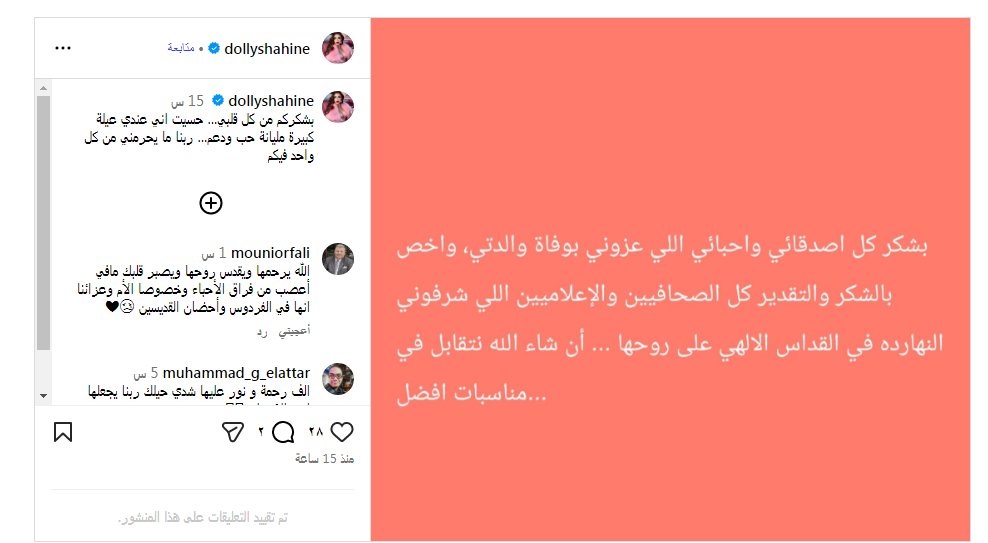 ودعت دوللي شاهين والدتها عبر منشور مؤثر على إنستجرام، وذكّرت الجميع بأن الإنسان من التراب وإلى التراب يعود، قائلة:
