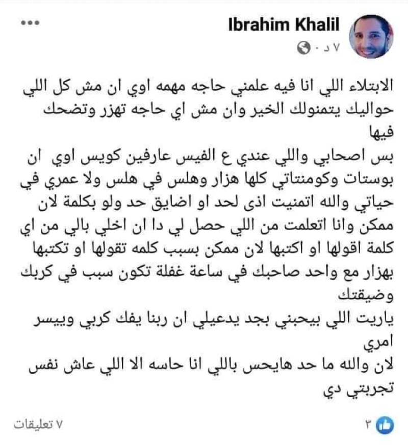 بعد انتشار الخبر، خرج إبراهيم خليل برسالة مؤثرة عبر حسابه الشخصي على فيسبوك، وصف فيها ما يمر به بأنه ابتلاء قاسٍ، مؤكدًا أن أصدقاءه والمقربين منه يعلمون جيدًا أن تعليقاته كانت دائمًا في إطار المزاح وليس التحريض الحقيقي.