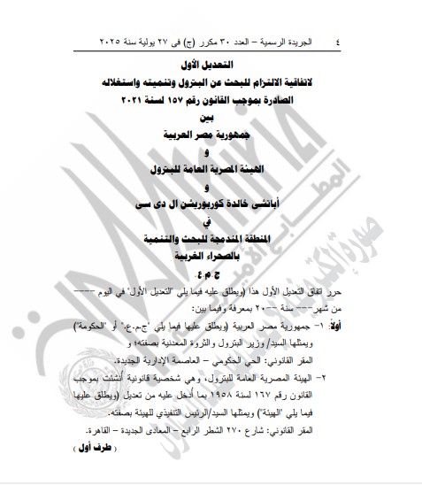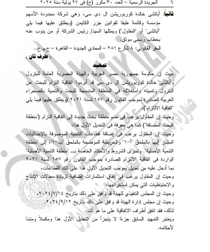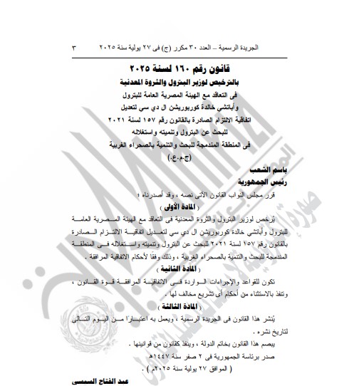 نشرت الجريدة الرسمية في عددها الأخير إعلان صدور القانون رقم 160 لسنة 2025، الذي حصل على موافقة وتصديق الرئيس عبد الفتاح السيسي، ويخول بموجبه الترخيص لوزير البترول والثروة المعدنية التعاقد مع الهيئة المصرية العامة للبترول وشركة أباتشي خالدة كوربوريشن إل دي سي.