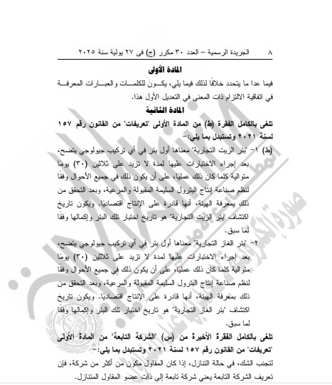 ويأتي هذا الإجراء ضمن سلسلة القوانين والتعديلات التي تصدرها الدولة لتعزيز الاستثمار في قطاع البترول والطاقة، وتأمين الموارد الاستراتيجية، بما يساهم في دعم الاقتصاد الوطني وتعزيز الإنتاج المحلي للطاقة.